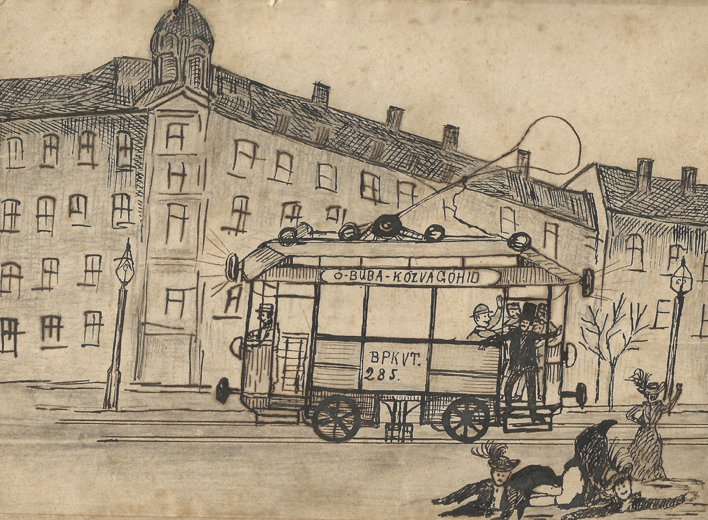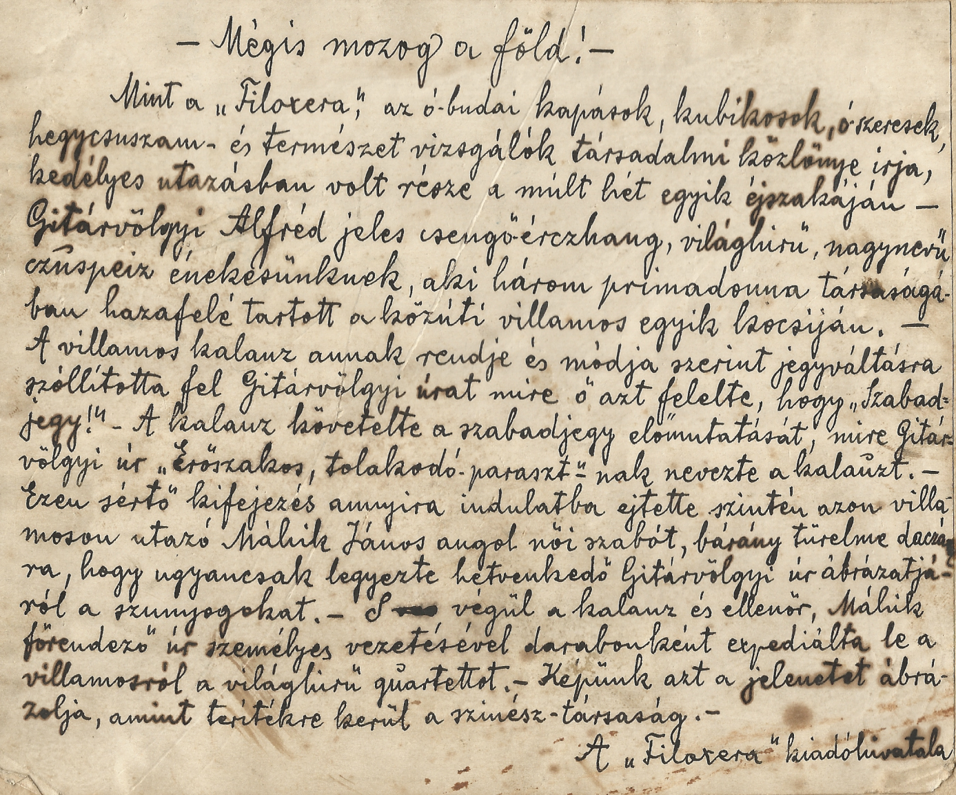 Mint a „Filoxera” az ó-budai kapások, kubikosok, ószeresek, hegycsuszam- és természetvizsgálók társadalmi közlönye írja, kedélyes utazásban volt része a múlt hét egyik éjszakáján Gitárvölgyi Alfréd jeles csengő-érczhang, világhírű, nagynevű csuszpeiz énekesünknek, aki három primadonna társságában hazafelé tartott a közúti villamos egyik kocsiján. A villamos kalauz annak rendje és módja szerint jegyváltásra szólította fel Gitárvölgyi úrat, mire ő azt felelte, hogy ”Szabadjegy!” A kalauz követelte a szabadjegy előmutatását, mire Gitárvölgyi úr „Erőszakos, tolakodó paraszt”-nak nevezte a kalauzt. Ezen sértő kifejezés annyira indulatba ejtette szintén azon a villamoson utazó Máhik János angol női szabót, bárány türelme daczára, hogy ugyancsak legyezte hetvenkedő Gitárvölgyi úr ábrázatjáról a szunyogokat. S végül a kalauz és ellenőr Máhik főrendedző úr személyes vezetésével darabonként expediálta le a villamosról a világhírű quartettet. Képünk azt a jelenetet ábrázolja, amint terítékre kerül a szinész-társaság.